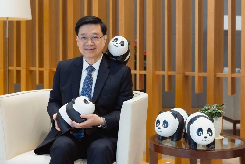 李家超懷抱熊貓玩偶 為“安安”“可可”周末亮相預熱