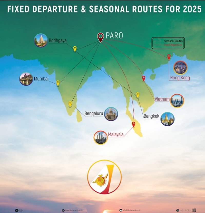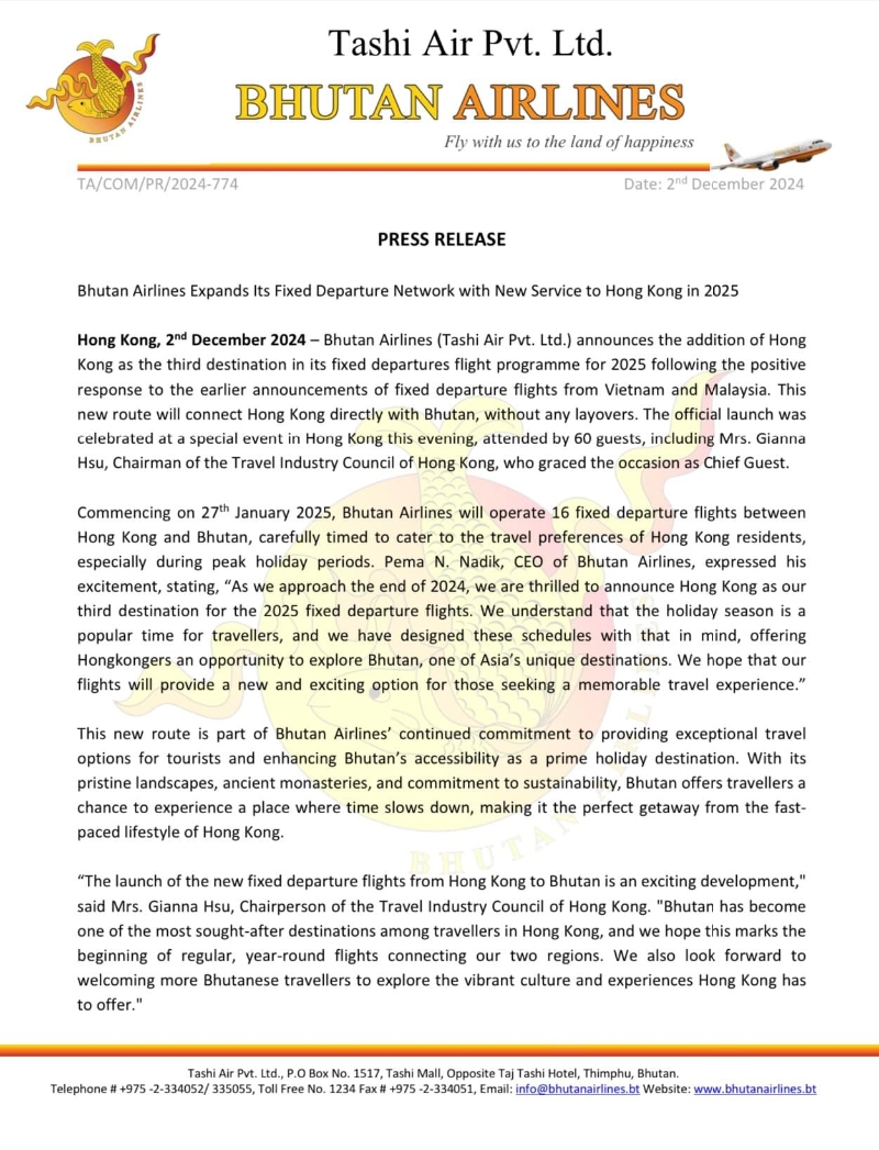 不丹航空宣佈,2025年1月25號起營運16班固定航班往返香港及不丹。 暫定不丹(帕羅)航班時間: • 去程:B3789 0535/0750 • 回程:B3788 1600/0040+1 暫定不丹(帕羅)航班日期: • 2025年1月29日至2月3日 • 2025年4月17日至4月22日 • 2025年5月1日至5月6日 • 2025年5月28日至6月2日 • 2025年7月30日至8月4日 • 2025年10月2日至10月7日 • 2025年12月23日至12月28日