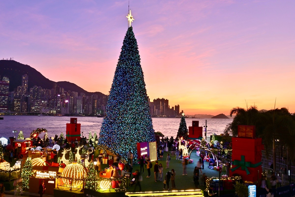 香港新聞網12月24日電 維港兩岸換上璀璨新裳,聖誕佳音全城奏響,為寒冬帶來溫暖喜悅。 西九文化區聖誕小鎮登場,巨型聖誕樹矗立其中,四周滿布五彩繽紛的禮物盒,更有聖誕造型的熊貓擺設同賀佳節。藝術公園海濱草坪設有聖誕市集,各國美酒佳餚琳瑯滿目,加上指定日子綻放的冬日維港水上煙火,倍添節慶氣氛。