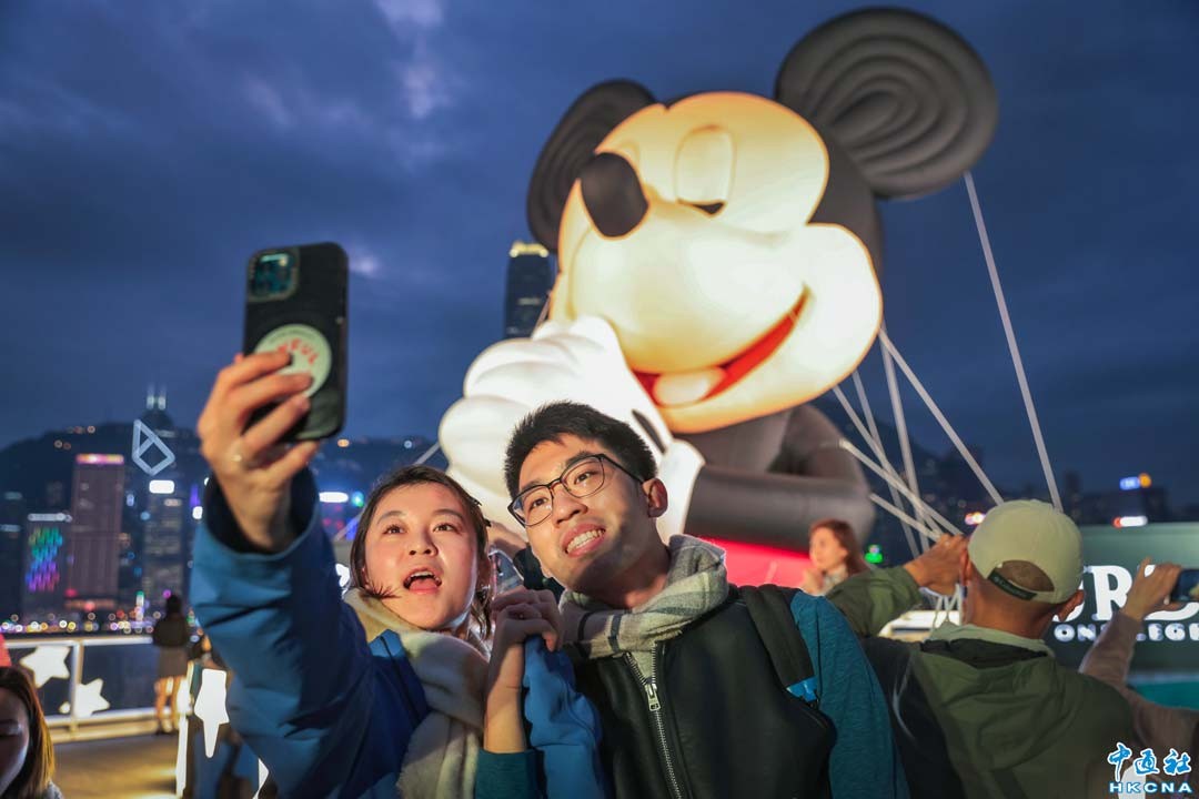 1月4日,大批遊客和香港市民與巨型米奇玩偶合影。7米高的巨型米奇WISHER是全球首次亮相,坐落香港海港城海運觀點,米奇雙手合十,真誠仰望,祈求著好運來臨,不僅是對未來的憧憬,更是對心願的實現。(香港中通社記者 謝光磊攝)