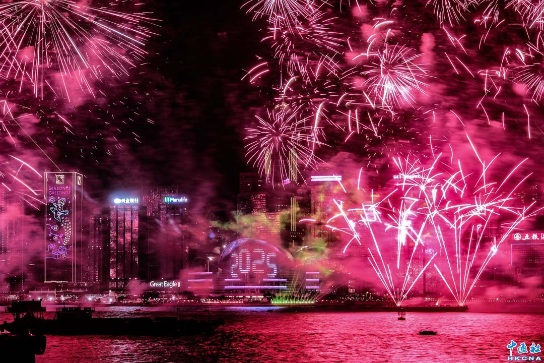 2025年1月1日0時,香港維多利亞港上演煙花匯演,迎接2025年的到來。匯演歷時12分鐘,以“幸福樂章”為主題,以大自然元素為設計概念,通過煙花展示大自然的不同形態,傳遞對美好生活的祝願。(香港中通社記者 許其皓攝)