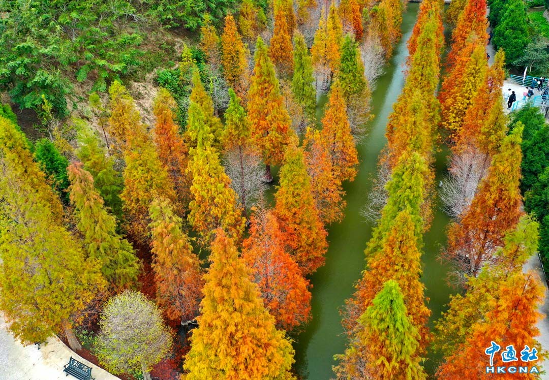 台灣苗栗縣三灣鄉落羽松莊園秘境,浪漫台3線森林湖泊落羽松, 目前落羽松進入最美時期,橘紅色的葉片映照在水面,水中划船,宛如畫中風景,絕佳景色。香港中通社圖片
