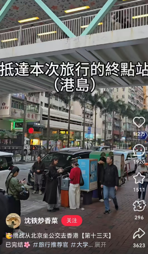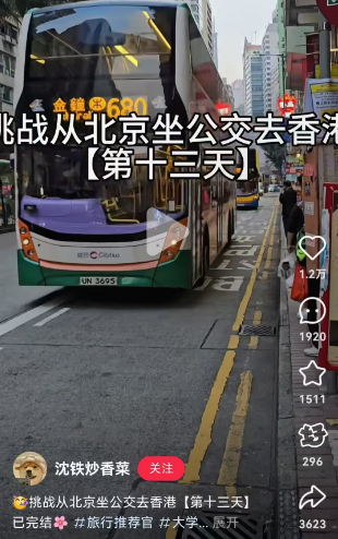 近日,社交平台小紅書上,這樣一系列短視頻“火”了:“挑戰從北京坐公交去香港,第xx天”。網友“沈鐵炒香菜”以豎版vlog形式拍攝視頻,記錄了自己坐公交去香港的13天經歷,視頻內容亦從“第1天”更新至“第13天”。