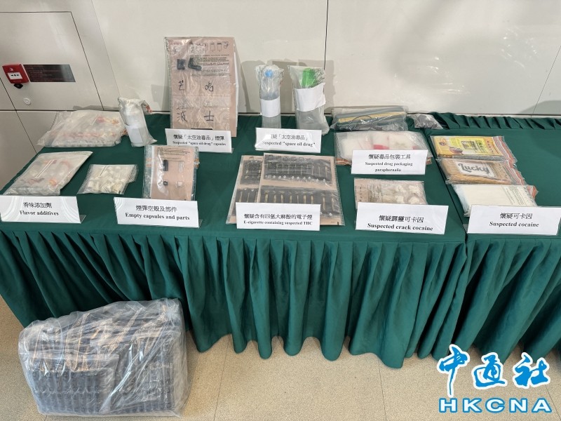 第二宗案件檢獲的懷疑“太空油毒品”、懷疑可卡因、懷疑霹靂可卡因、懷疑“太空油毒品”煙彈及懷疑含有四氫大麻酚的電子煙。 香港中通社圖片 首宗案件中,海關人員鎖定一名懷疑管控毒品倉的外籍男子,在搜查有關單位後,檢獲約33公斤懷疑冰毒,並即場拘捕報稱按摩師的41歲男子,他已被控一項販運危險藥物罪。 第二宗案件中,海關人員鎖定一名懷疑管控位於元朗製毒工場的本地男子,並在大埔截查該男子,在其手持膠袋內檢獲懷疑可卡因,遂將他拘捕並帶到元朗處所搜查,再檢獲懷疑“太空油毒品”、含有四氫大麻酚的電子煙和製毒工具等。被捕男子37歲,報稱無業,被控以三項販運危險藥物罪及一項管有第一部毒藥罪的罪名,9日在粉嶺裁判法院提堂。 農曆新年假期將至,海關預計本地毒品需求會有所增加,會於長假期前夕進一步加強執法,嚴厲打擊各類販毒活動。(完) 【編輯:林曉惠】
