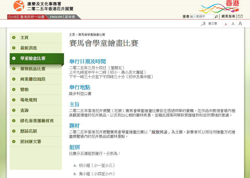 比賽分五個組別進行,分別為初小組(小一至小三)、高小組(小四至小六)、初中組(中一至中三)、高中組(中四至中六)及大專組。小學組別及大專組的比賽時間為當日上午9時至中午12時,中學組別的比賽時間則為當日下午1時30分至4時30分。 比賽旨在透過同學的筆觸,在作品中展現會場內的花卉展品或園林景點,藉此提高同學愛護植物和自然環境的意識。今次繪畫比賽的主題為“綻放英姿”,參賽者可以用任何繪畫方式表達主題。 查詢比賽詳情,請致電2302 1275/2302 1268或瀏覽花展網頁。中、小學生須透過所屬學校報名參加,大專生則可自行報名。參賽學校及大專組參加者須於2月10日或之前在網上報名。 今年花展以“綻放英姿”為主題,主題花是秋英。香港賽馬會慈善信託基金已連續13年支持花展,並於2014年起成為其主要贊助機構。 (完) 【編輯:譚暢】