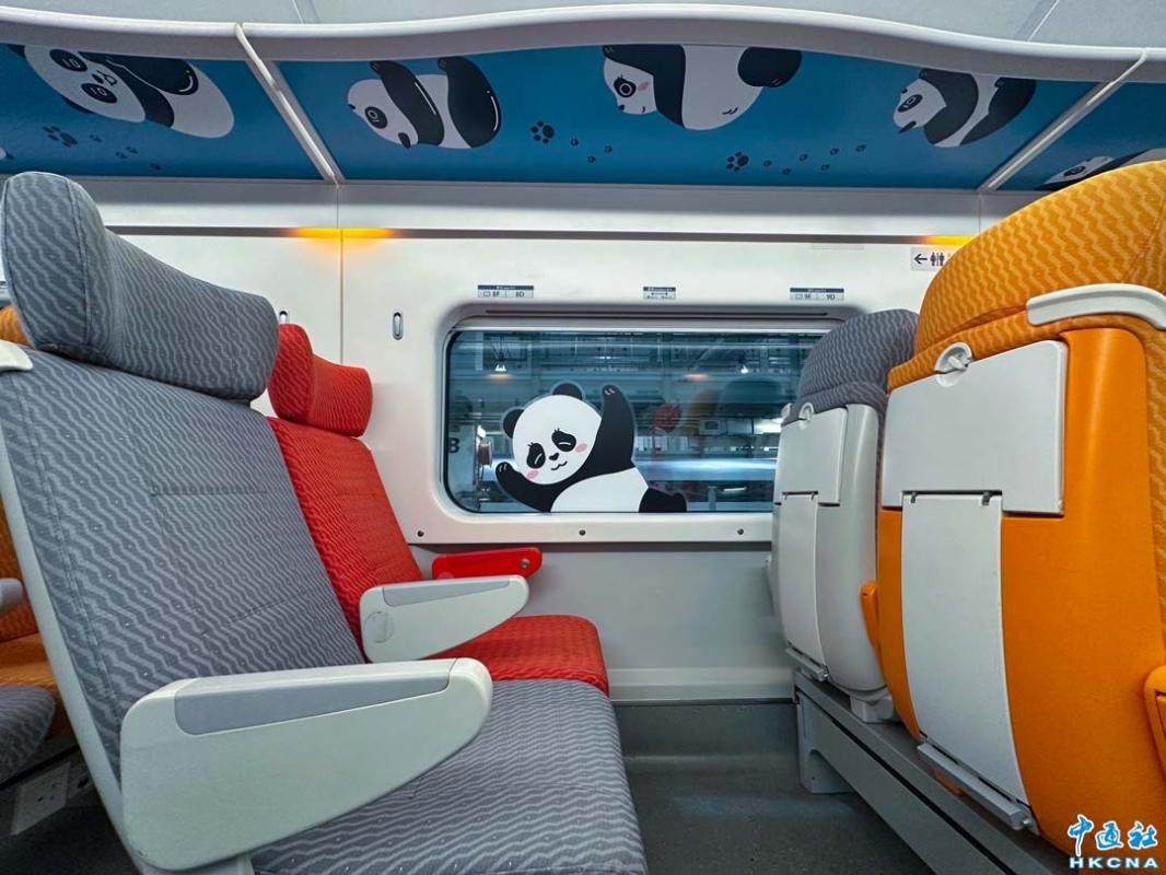 1月8日,港鐵夥拍香港旅發局推出的高鐵“香港熊貓列車”亮相,該列車本週六(1月11日)起,一連12個星期,逢週六日及指定時間行駛。“香港熊貓列車”由動感號改造,大熊貓圖案遍布車內、車外,不單化身高鐵司機,更擔任宣傳大使穿梭多個香港旅遊地標,為乘搭列車訪港的旅客介紹打卡點。(香港中通社記者 謝光磊攝)