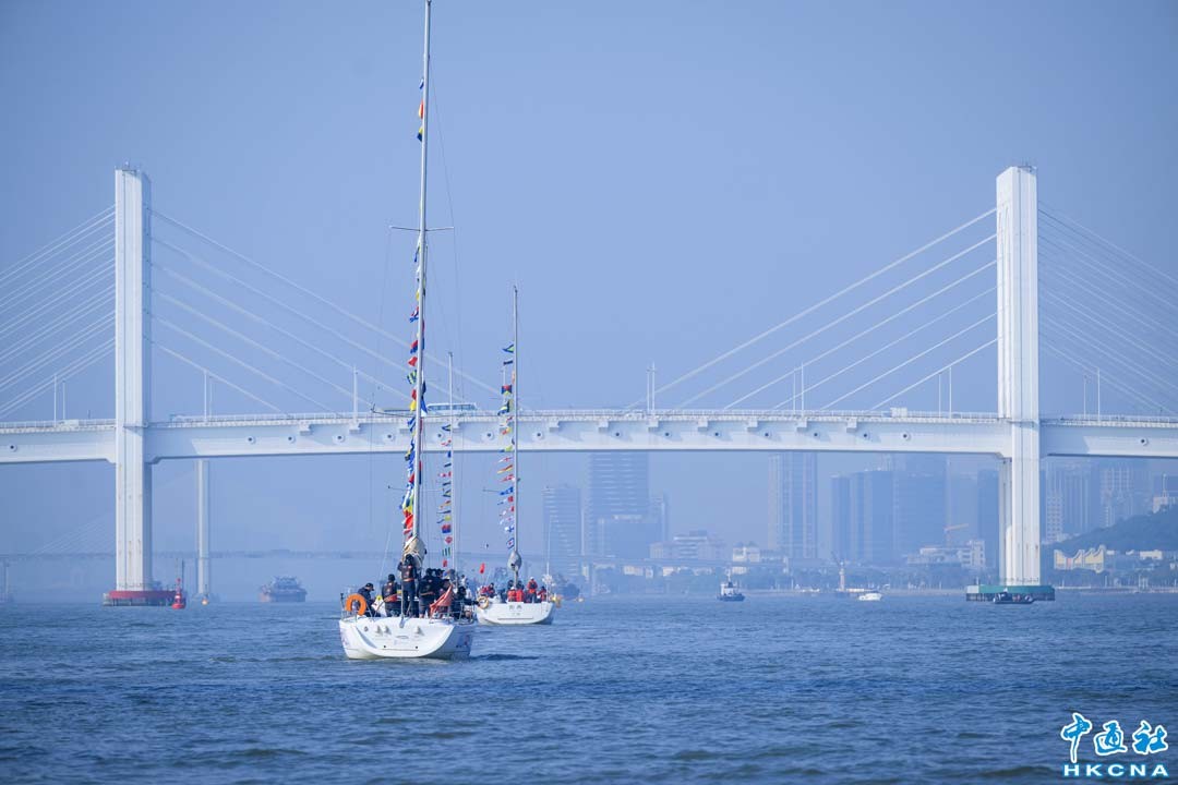 1月9日,“2025美高梅澳門國際帆船賽”進行第二個比賽日,主辦單位在漁人碼頭舉行鳴笛儀式並安排船隊巡遊,經澳門漁人碼頭、觀音蓮花苑及嘉樂庇總督大橋旅遊塔對開水域後折返。 香港中通社圖片