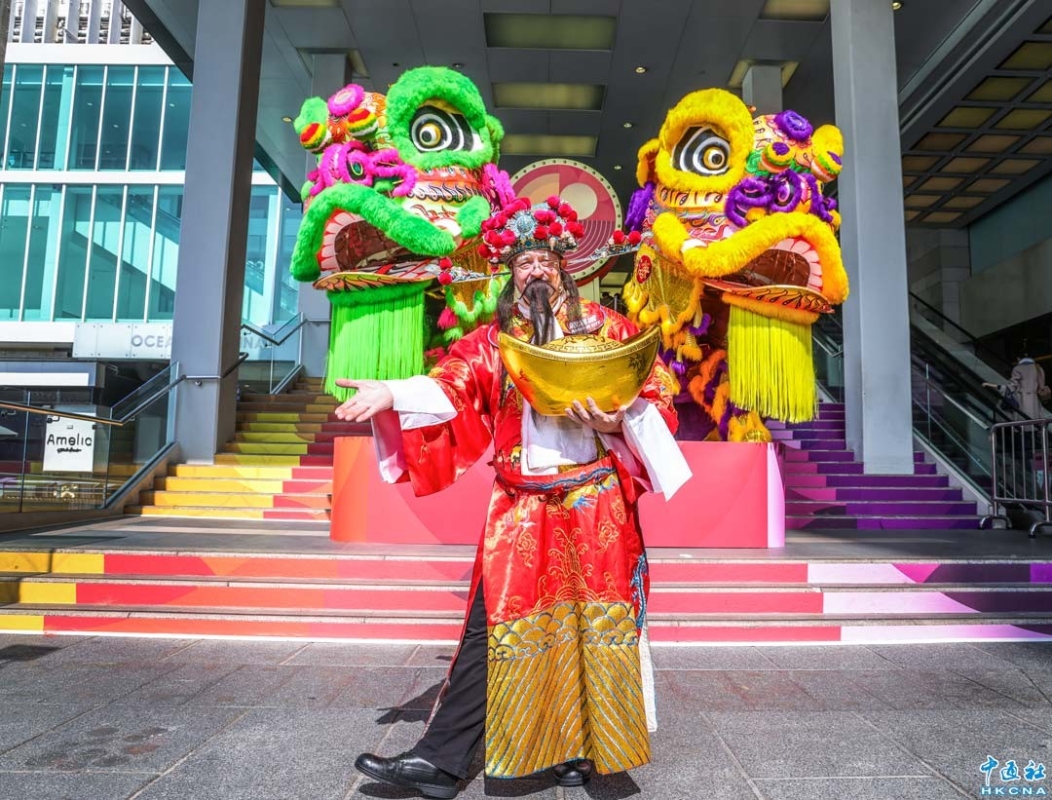 為迎新年,香港海港城以寓意“發”的中國幸運數字8及喜慶色彩為創作概念,在海運大廈露天廣場設置28米長的“百彩醒獅長廊”,展出十八頭喜慶色彩的醒獅及十三個傳統中國鼓。1月10日,18頭醒獅在海運大廈露天廣場作出迎新春表演,每款顏色的醒獅都承載著獨特的新春祝賀,例如“飛‘黃’騰達”、“一炮而‘紅’”、“平步‘青’雲”等,亦有“財神”現身與市民互動,氣氛熱烈。(香港中通社記者 曹文毓攝)