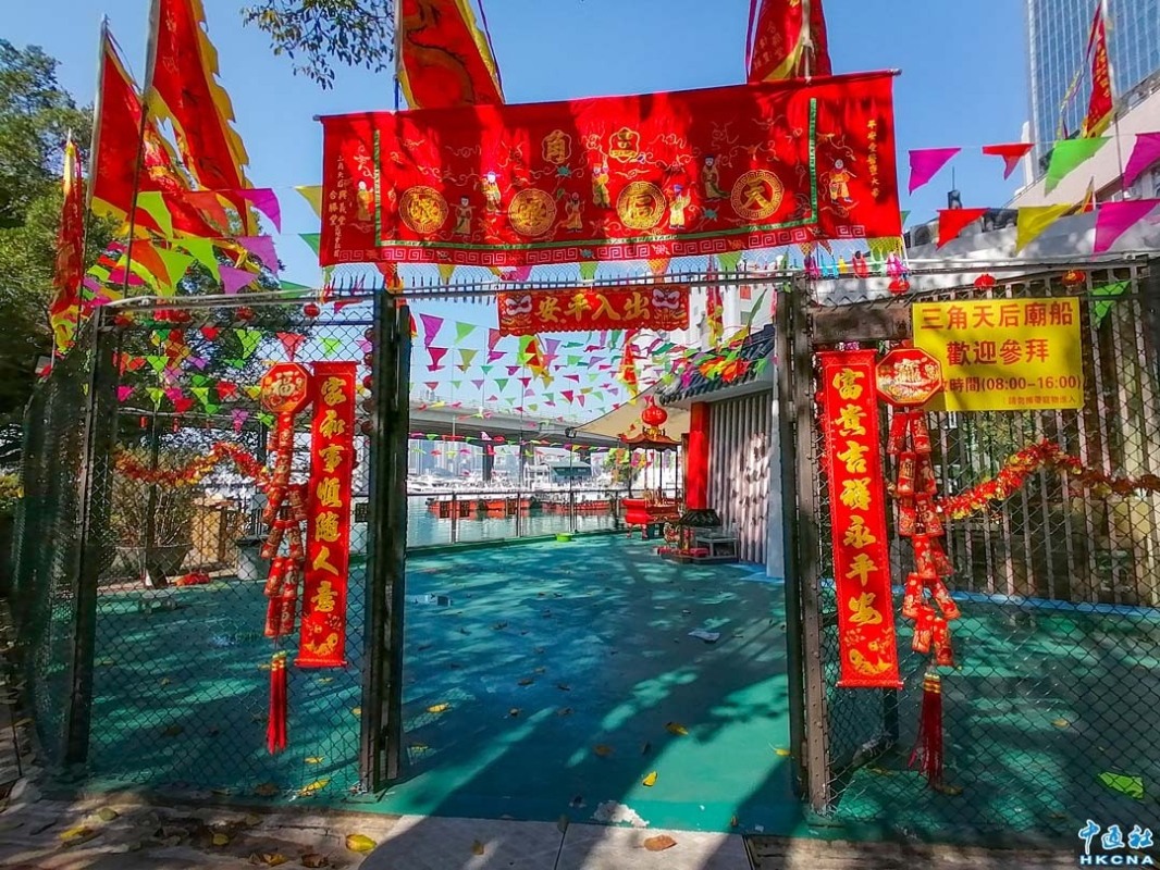 三角天后平安堂,位於香港銅鑼灣維園道海濱。水上三角天后廟船,原是一艘位於銅鑼灣避風塘海面的廟船,歷經三代船隻,殘舊的木船歷經風吹雨打,如市民或遊客想上廟參拜或參觀,亦必須先乘乘坐駁艇,十分不便。廟方多年來積極爭取將廟宇遷往陸上,方便善信參拜,最終獲政府批地,將廟船遷往銅鑼灣海濱消防局附近岸上,成為新的文化及旅遊景點。新廟設計構思保存廟船的特色,採用船型設計,靠近海旁,並保留舊有廟船的精髓。 (香港中通社記者洪少葵攝)