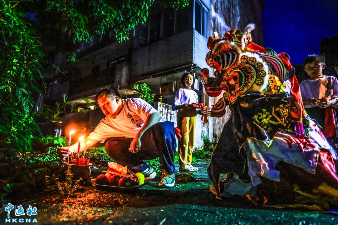 “先點千里眼放光明,順風耳耳聽八方,點鼻辨妖邪,點脷吐千孫,額上發紅光,點背鑼鼓震天庭,點腳踏四方,點身由頭好到尾,國泰民安,風調雨順,大吉大利,百無禁忌,響梆!”麒麟是中國傳統文化中的瑞獸,被人們視為吉祥和祥瑞的象征。2014年,香港西貢坑口客家舞麒麟被列入第四批國家級非遺代表性項目名錄。在西貢下洋村,麒麟紮作的第三代傳承人劉震宇向記者展示麒麟開光的過程。(香港中通社記者 曹文毓攝)