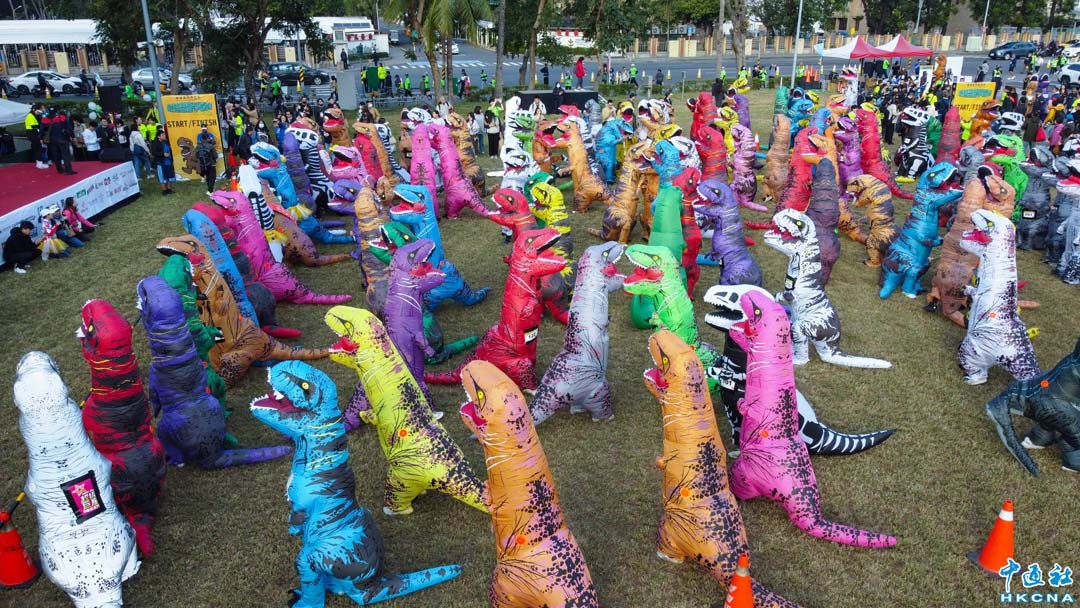 1月11日起,台灣高雄市一連兩日在世運主場館舉辦路跑盛事,休閒組的“恐龍路跑”打頭陣,230隻恐龍聚集草地競速。 香港中通社圖片