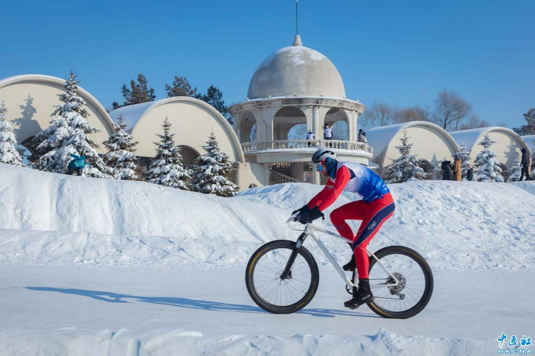 1月11日,2025第二屆上海合作組織雪地自行車賽暨第十一屆哈爾濱雪地自行車嘉年華,在哈爾濱太陽島風景區雪博園鳴槍開賽。來自上海合作組織相關國家的869名自行車運動員和愛好者參加了比賽,此外還有來自世界各地的近萬名自行車愛好者參加了線上組的比賽。選手在比賽中穿越太陽島風景區、雪博園主景區的冰雪賽道,也讓選手們在騎行中領略雪雕、冰雕藝術,充分感受到了哈爾濱冰雪文化的魅力。(何飆 攝)