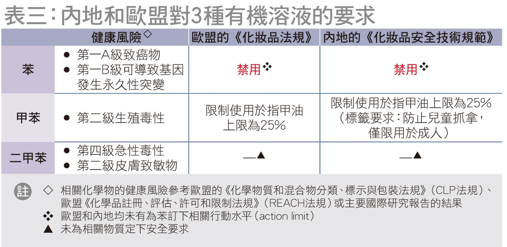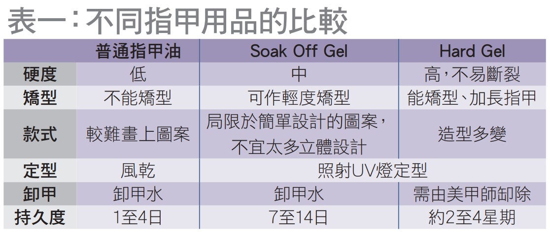 內地和歐盟對3種有機溶液的要求。(資料來源:香港消費者委員會) “Gel甲”小貼士: 在追求美的同時,香港醫學會會董及皮膚專科醫生陳厚毅也提醒愛美女士採取以下措施保護自身健康: 1、降低美甲頻率:建議消費者每隔2至3個月,便停止美甲一段時間,讓指甲休息,同時保養指甲的健康。美國克利夫蘭診所的皮膚科醫生梅麗莎·皮良(Melissa Piliang)亦認為,一年數次是比較安全的頻率。 2、選擇安全產品、信譽良好的美甲店:優先選擇衞生程度高、會採用較優質的美甲產品等,以減低對指甲健康的傷害。消費者亦可考慮自己購買一套美甲用品於美甲店使用,可大大減少因修甲時共用工具而令指甲感染真菌和灰甲的風險。 3、保持通風:由於指甲油種含不少有害的揮發性物質,消費者在進行美甲時,確保在通風良好的環境中使用甲油膠,避免長時間接觸有機溶劑的氣味。 4、採取防護措施:在美甲時佩戴手套,或塗抹防曬產品,以減少對皮膚的潛在傷害。同時應留意指甲的健康狀況,若指甲受感染例如灰甲,而仍然堅持進行美甲,或會令細菌被困,造成惡性循環,令灰甲難以復原;另外,進行“hard gel”(高黏合建構)時需要打磨指甲表面,若指甲太脆或太薄都不適合進行。 儘管美甲能帶來視覺上的享受,但保持警惕和採取適當的防護措施,才能更安全地享受這一時尚。(完) 【編輯:黃璇】