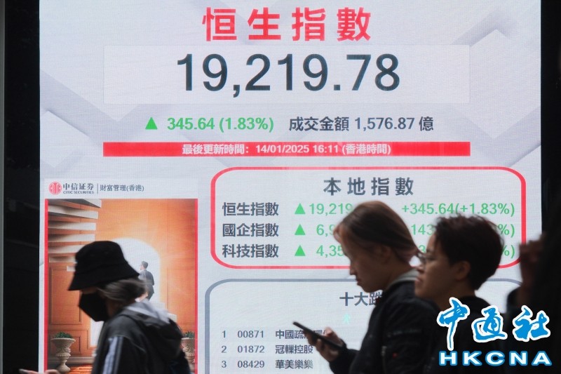 香港中通社1月14日電(記者 譚暢)港股14日回升,止住連日跌勢。恒指升345點或1.8%,報19219點。大市全日成交約1576.9億港元。