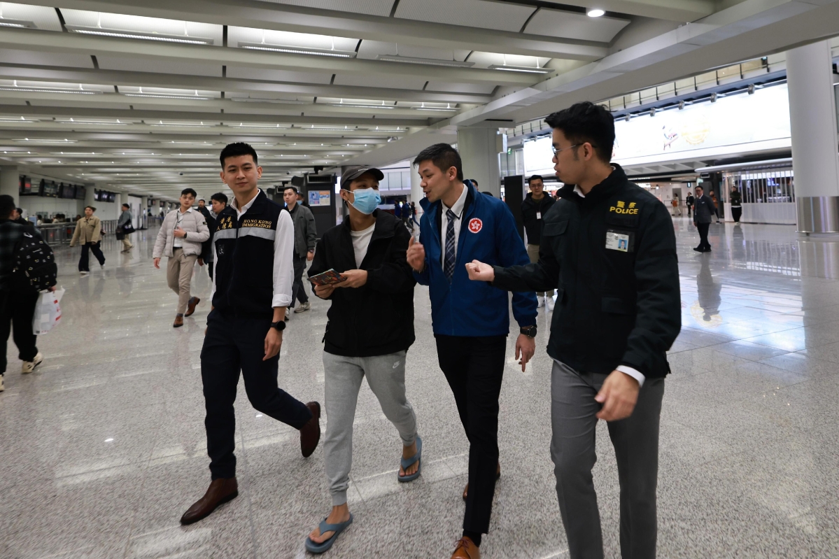 香港新聞網1月28日電 一名在緬甸被禁錮從事非法工作並獲救的香港男子,1月28日凌晨由泰國返港,在保安局專責小組成員陪同下抵達機場。保安局在機場表示,仍有10名港人未獲釋,一名同事留守曼谷跟進。 據保安局公佈的官方照片,獲救港人與保安局人員抵達機場,照片中正面鏡頭,戴著口罩難掩開心笑容,頭戴黑色鴨舌帽,腳穿人字拖鞋。