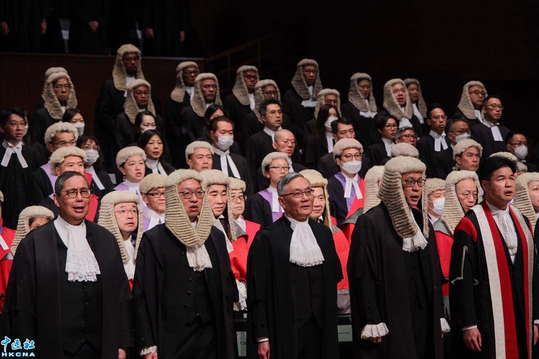 香港2025年法律年度開啟典禮1月20日在香港大會堂舉行。圖為香港終審法院首席法官張舉能(前排中)、香港特區政府律政司司長林定國(前排左二)等出席典禮。(香港中通社記者 許其皓攝)