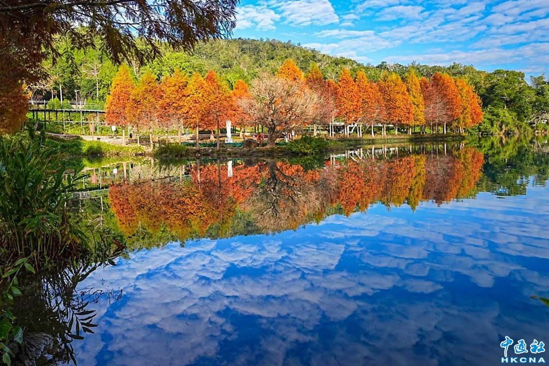 台灣南投日月潭向山遊客中心旁、整排落羽松逐漸轉紅,層層山景湖景,跟台灣最美自行車道相映成趣,構成油畫般的風情畫,也成為民眾假日打卡的熱門新景點。 香港中通社圖片