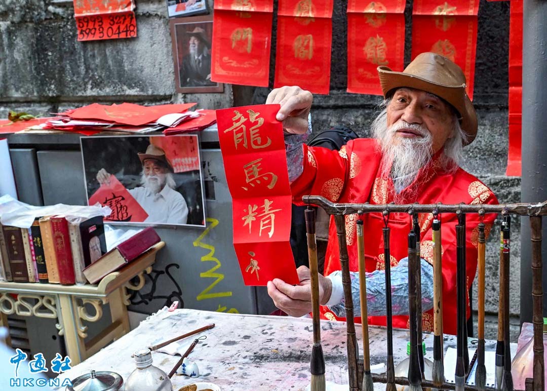 今年87歲,頭戴牛仔帽,身穿紅色唐裝、飄逸白髮鬍鬚的郭騰龍老先生在上環荷李活道樓梯街附近擺攤位為市民寫揮春對聯。(香港中通社記者 洪少葵攝)