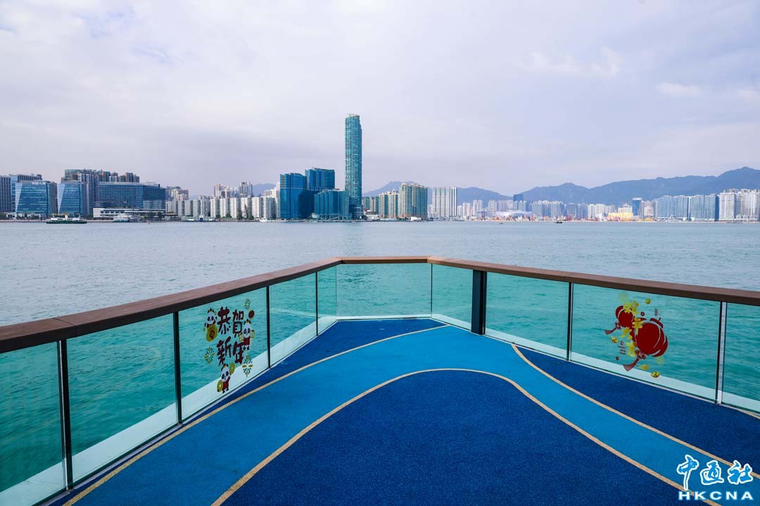 香港北角東岸板道(西段)1月26日起開放予公眾使用。東岸板道全長約2.2公里,分為東西兩段,巧妙利用現有東區走廊下的空間,是貫通港島北海岸線的重要海濱設施。西段長約1.1公里,當中700米是連接東岸公園主題區至北角海濱花園的板道,400米是經優化的北角海濱花園。圖為觀景台。(香港中通社記者 曹文毓攝)
