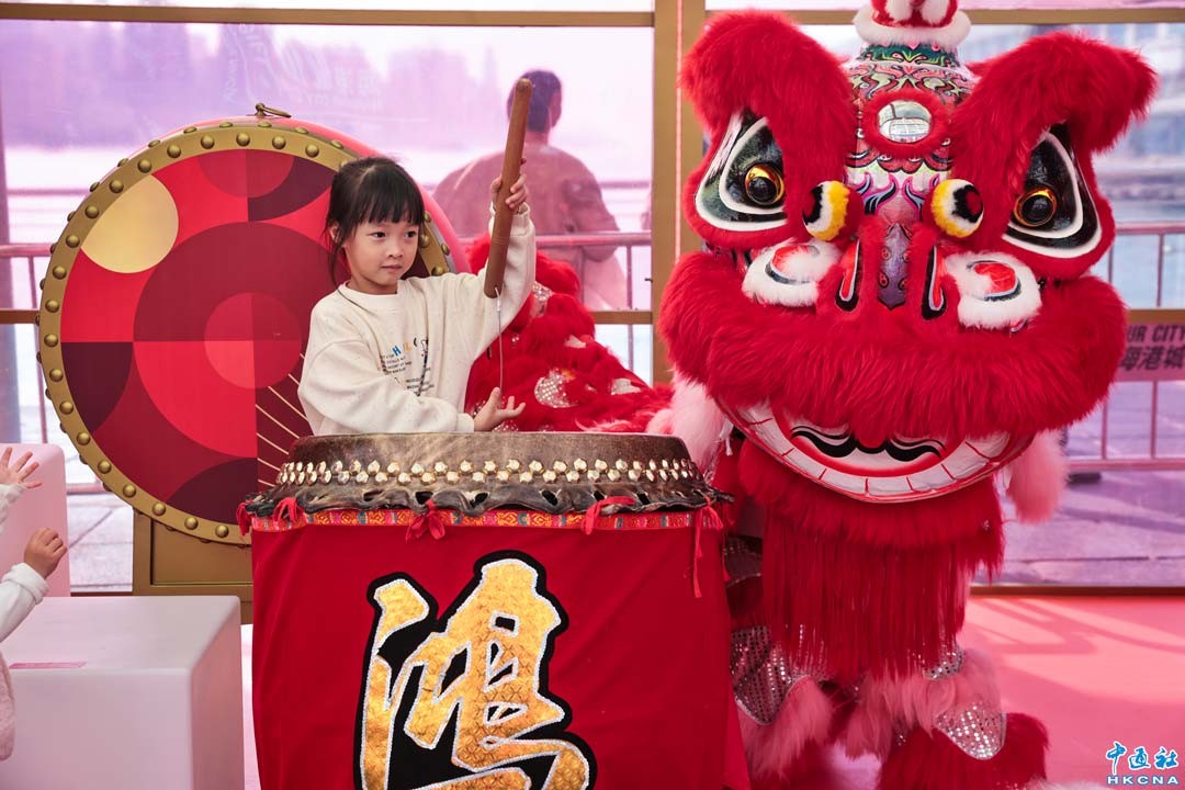1月23日,大批香港市民和遊客在海港城與喜慶醒獅互動。為迎新年,香港海港城以寓意“發”的中國幸運數字8及喜慶色彩為創作概念,在海運大廈露天廣場設置28米長的“百彩醒獅長廊”,展出十八頭喜慶色彩的醒獅及十三個傳統中國鼓。(香港中通社記者 謝光磊攝)