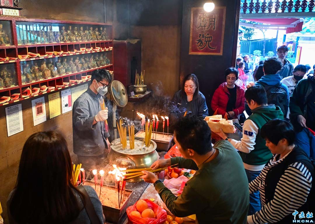 農曆新年前夕,位於上環荷李活道的文武廟有許多來自世界各地遊客進香朝拜。文武廟估計建於1847至1862年間,對香港具有重要的歷史和社會意義,反映昔日香港華人的社會組織和宗教習俗。 (香港中通社記者 洪少葵攝)