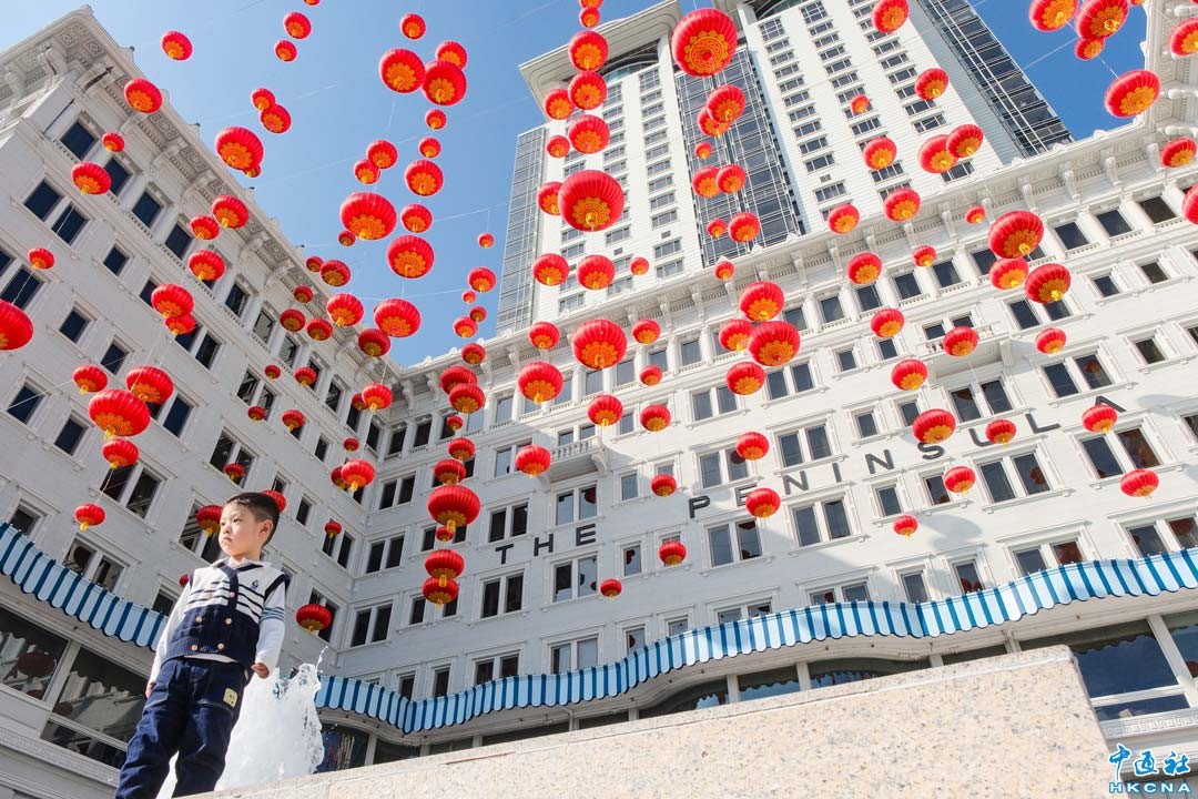 春節臨近,近期香港街頭春節氣氛越來越濃。圖為香港半島酒店門口高掛大紅燈籠迎接春節。(香港中通社記者 許其皓攝)
