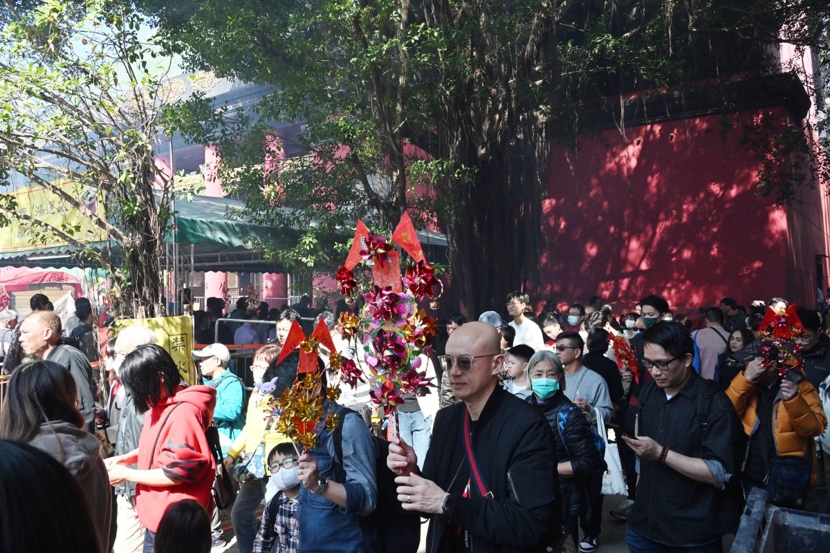 眾多市民到沙田車公廟參拜,市民攜帶香燭、風車入場並求籤
