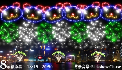 九幕煙花各具特色,有幸運紅色“8”字和金元寶圖案,也有以大熊貓為主題的煙花,六個可愛的熊貓頭在維港上空出現,代表大熊貓安安、可可、盈盈、樂樂,以及新生龍鳳胎,在綠色的竹葉及銀色的流光襯托下,象徵快樂團圓。壓軸一幕“瑞蛇豐年”,“游星”煙花在空中起舞,將現場熱烈氣氛推向最高點。