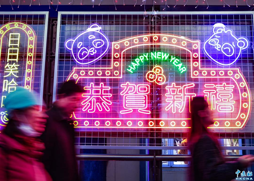 1月27日晚,春節臨近,香港中環一行人天橋被賀年燈飾裝飾一新,“恭賀新禧”“全年行好運”“發財”“大吉大利”“福”等各種喜慶字句充滿節日氛圍,吸引許多遊人關注。(香港中通社記者 謝光磊攝)