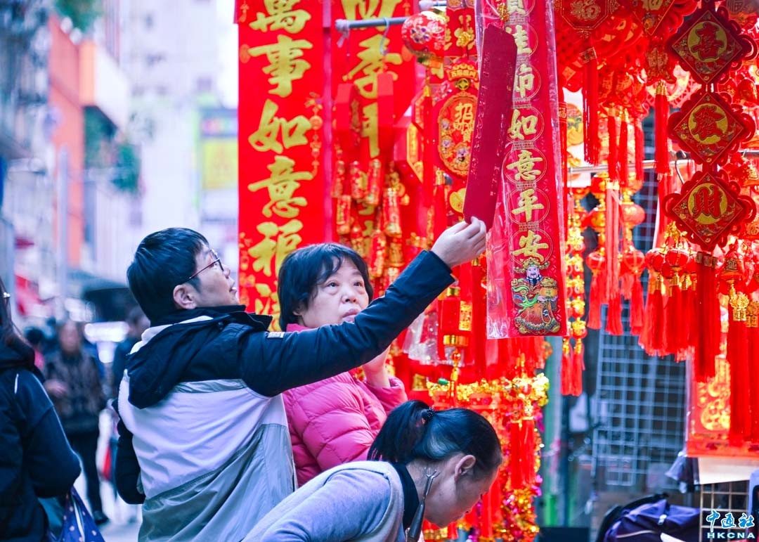 1月28日上午,香港北角春秧街熱鬧非常,大批市民在除夕當天選購新鮮食材準備歡度新年,街市有各種海鮮、雞鴨魚肉、水果蔬菜、鮮花盆景林林總總,街道兩旁攤檔生意興隆。圖為市民在選購賀年彩飾。(香港中通社記者 洪少葵攝)