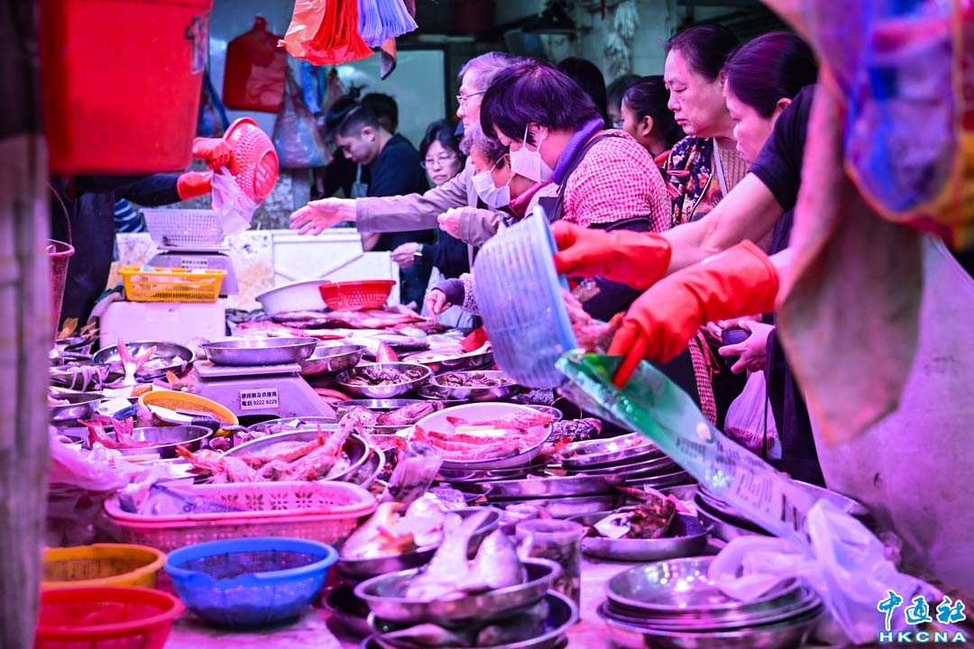 1月28日上午,香港北角春秧街熱鬧非常,大批市民在除夕當天選購新鮮食材準備歡度新年,街市有各種海鮮、雞鴨魚肉、水果蔬菜、鮮花盆景林林總總,街道兩旁攤檔前水洩不通。圖為海鮮攤檔。(香港中通社記者 洪少葵攝)