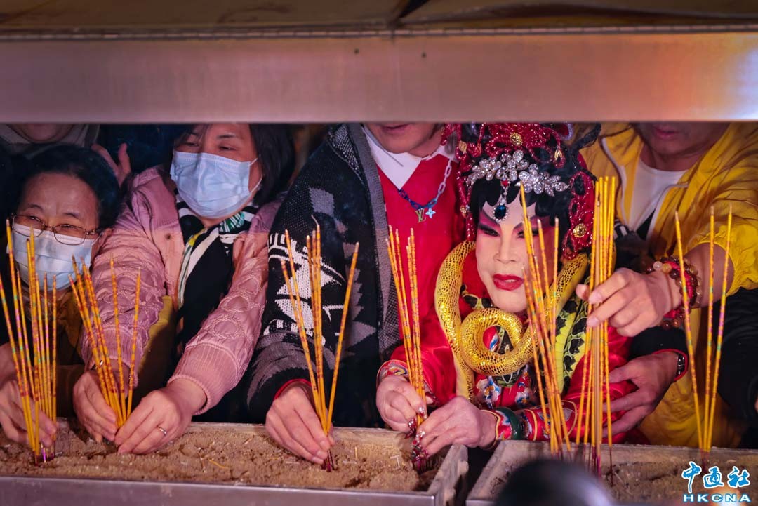 1月28日是除夕,在晚上11時為傳統時辰子時,是新一日開始,也即新一年到來。大批善信到黃大仙祠,上蛇年頭炷香祈福。圖為“頭炷香”活動的常客、94歲藝人黃夏蕙上頭炷香。(香港中通社記者 謝光磊攝)