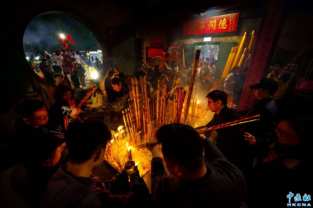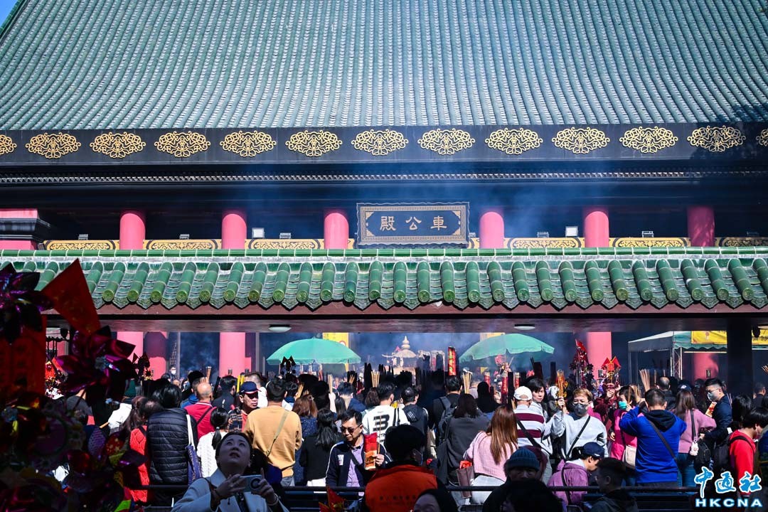 1月30日大年初二,香港眾多市民到沙田車公廟參拜,市民攜帶香燭、風車入場並求籤。祈求新一年萬事如意、身體健康、工作順利。上午9時至中午12時,車公廟共有12867人次進廟。當天早上,不少市民在車公廟開門前已排隊等候入場。中午時分大批市民更需要輪候進廟祈福。(香港中通社記者 洪少葵攝)