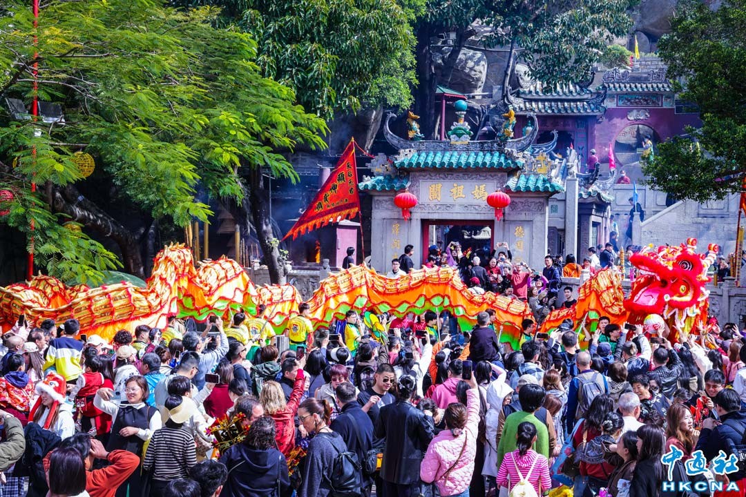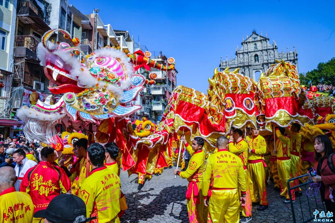 新春期間,澳門年味濃鬱,媽閣廟前長龍翻騰,金獅悅動,鑼鼓喧天中洋溢著新年喜悅的氣氛。 香港中通社圖片
