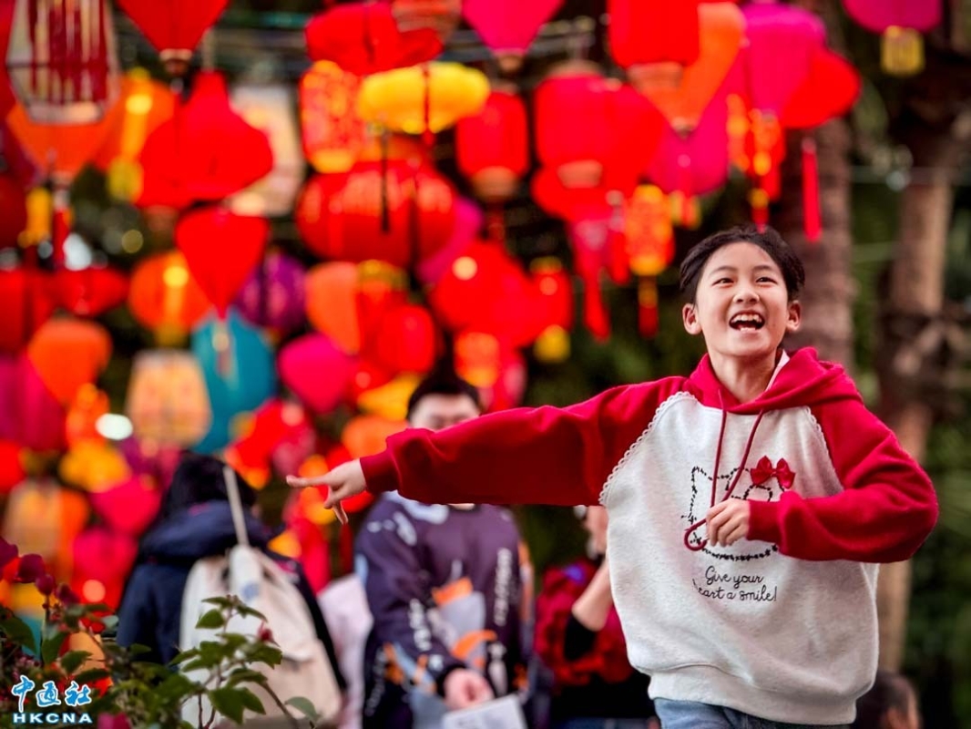 新春期間,中國廣東省廣州年味濃鬱,越秀公園內五羊石雕、明城牆張燈結彩,到處洋溢著新年的喜慶。圖為小孩快樂地奔跑在繽紛的綵燈下.(香港中通社記者 徐文峰攝)