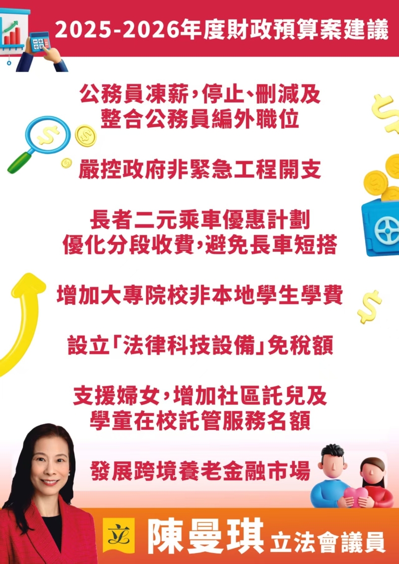 香港新聞網2月5日電 香港立法會議員陳曼琪4日向特區政府財政司司長陳茂波,提出2025-2026年度財政預算案建議共21項。