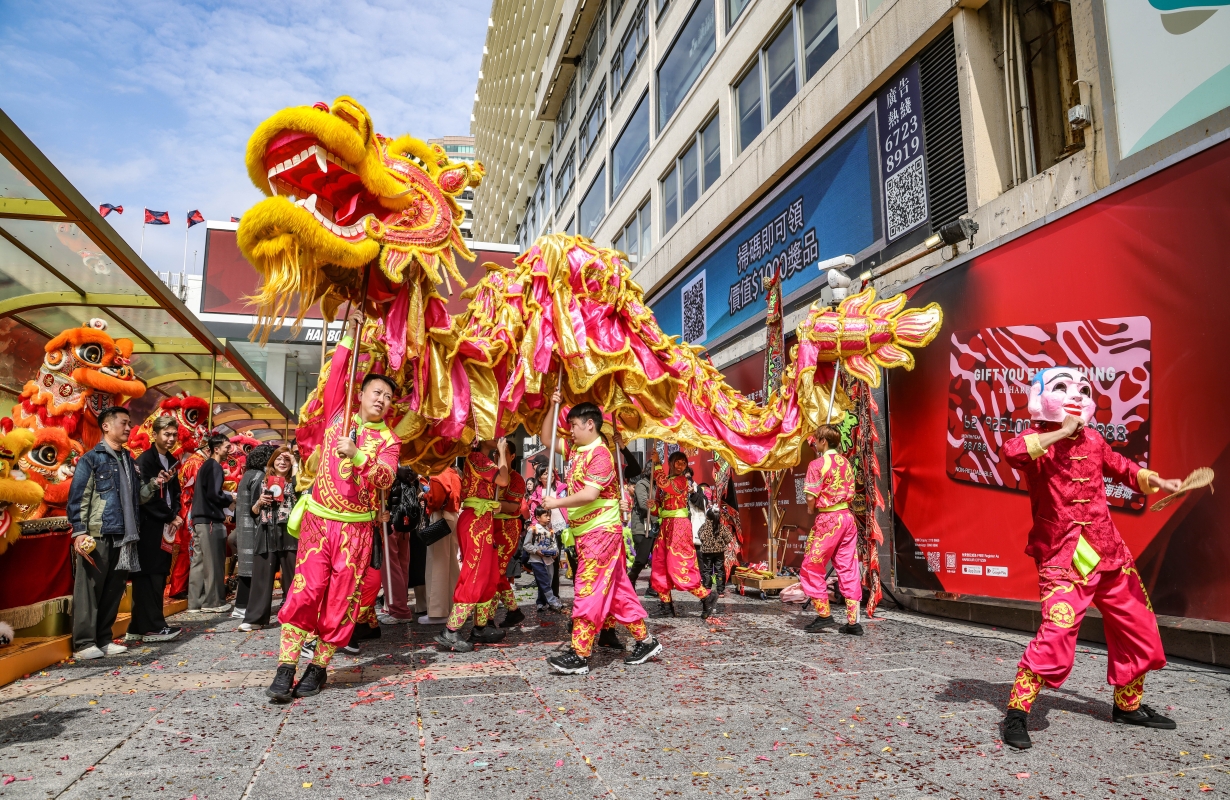 香港新聞網2月6日電  (記者 曹文毓)2月6日,大年初九,香港不少商場陸續舉行開市儀式。當天,香港海港城於海運大廈露天廣場舉辦“金龍獻瑞醒獅賀歲”活動,新春佳節氛圍熱鬧喜慶。主禮嘉賓於活動主持點睛儀式後,金龍和醒獅在熱鬧的鑼鼓聲中跳躍翻騰,預示蛇年事事順境、風生水起。