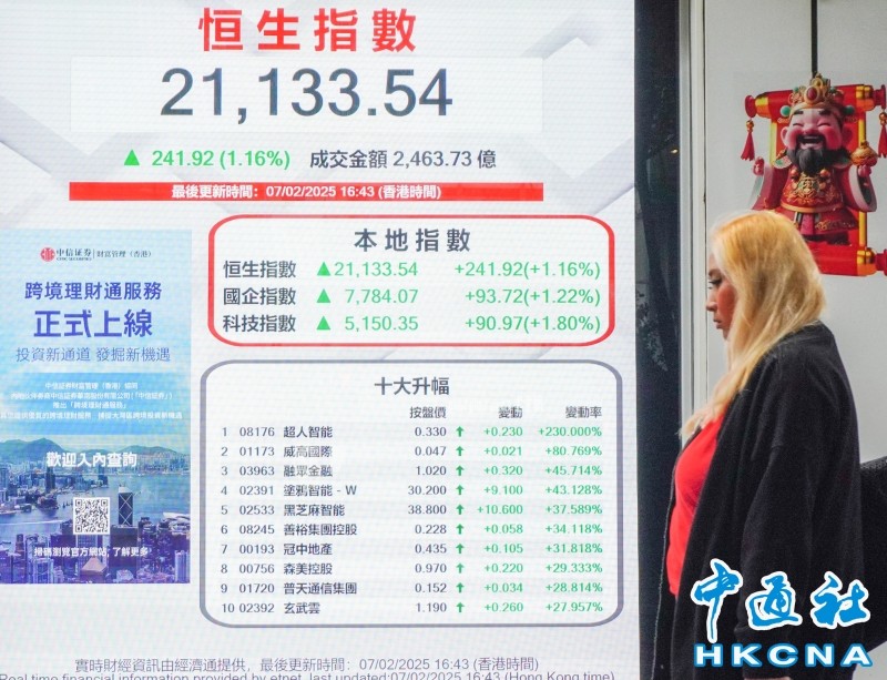 香港中通社2月7日電(記者 譚暢)香港恒指7日升241點或1.2%,報21133點。大市全日成交約2463.7億港元。總結全周,受益於人工智能(AI)熱潮,恒指共升908點或4.5%,三大指數集體走強。