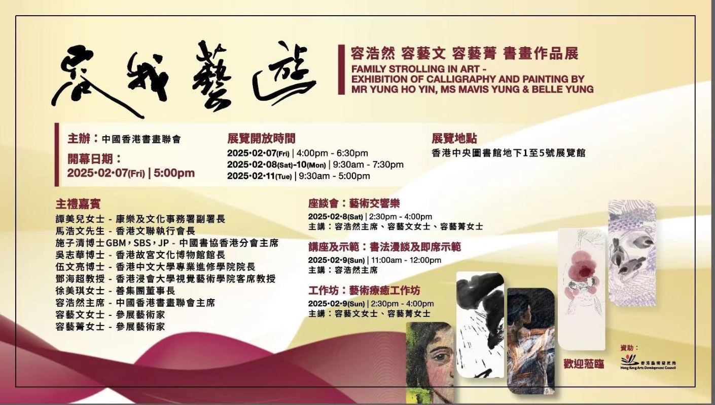 2月8日下午舉辦的《藝術交響樂》座談會,三位藝術家將與大家共同探討藝術創作理念及他們的藝術人生,為觀眾帶來深入的藝術解讀。2月9日上午,容浩然先生帶來的書法漫談及即席示範,讓觀眾近距離領略到傳統書法藝術的魅力與精髓;同日下午,容藝文、容藝菁女士主講的藝術療愈工作坊,則從藝術與生活的融合角度,為觀眾帶來全新的藝術體驗。 此次參展的三位藝術家各具特色,藝術風格鮮明。容浩然先生作為中國書協理事、香港書法名家,在隸、楷、行、草等多種書體上均有深厚造詣,其師從曾任中國書協主席的張海先生,書法作品展現出傳統與創新的完美結合。容藝文女士畢業於中央美院中國畫花鳥專業,作為香港美協理事,她的花鳥畫色墨淡雅,以金魚、雀鳥等題材展現出女性藝術家獨有的細膩與柔美。容藝菁女士畢業於香港中文大學進修學院西方藝術及中國書法專業,曾任多所學校的駐校藝術家,她的西畫作品色彩鮮艷、曲線流暢,充滿了熱情洋溢的活力與現代氣息。 此次展覽不僅是三位藝術家的作品展示,更是藝術交流與學習的平台,歡迎有興趣的觀眾屆時前往香港中央圖書館地下1至5號展覽館,共同欣賞這場精彩的藝術盛宴,探索書畫藝術的魅力與深度。 展覽開放時間: • 2025年2月7日下午4時至6時半 • 2025年2月8日至10日上午9時半至下午7時半 • 2025年2月11日上午9時半至下午5時半 活動詳情: • 座談會:藝術交響樂 (2025年2月8日下午2時半至4時;主講人:容浩然、容藝文、容藝菁) • 講座及示範:書法漫談及即席示範(2025年2月9日上午11時至12時;主講人:容浩然) • 工作坊:藝術療愈工作坊(2025年2月9日下午2時半至4時;主講人:容藝文、容藝菁) (完) 【編輯:譚暢】