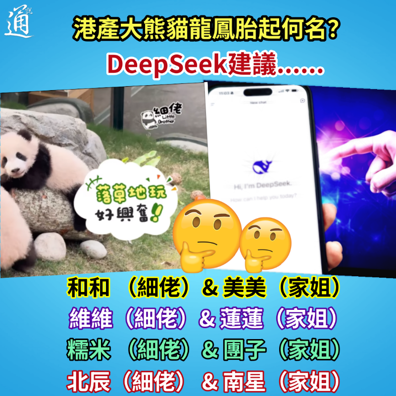 “各美其美,美人之美,美美與共,天下大同”是社會學家費孝通先生提出的不同文明之間的共處原則,被稱作是處理不同文化關係的“十六字箴言”,頗具中國式的傳統智慧。 方案二:維維(細佬)& 蓮蓮(家姐) DeepSeek指,“維”取自“維港”,象徵香港的活力動脈,同時有“維繫生態”之意,呼應熊貓作為生物多樣性保護的旗艦物種身份。 旗艦物種是指容易受到人們喜愛或關注的物種,牠們對生態保護具有特殊的號召力和吸引力。大熊貓除是中國的“國寶”、中國獨有的珍稀動物外,也是旗艦物種。 至於“家姐”用“蓮”字,DeepSeek解釋,“蓮”代表純潔堅韌,象征香港歷經風雨,仍呈現出蓬勃的生機。同時諧音“連連”,亦是祈願熊貓家族生生不息。 此外,“蓮”的文化意象也被內地客熟知,容易令人產生親切感。 方案三:糯米 (細佬)& 團子(家姐) “糯米”一詞的靈感源自香港傳統小吃“糯米糍”,DeepSeek形容,其軟糯口感契合熊貓幼崽的憨態,亦隱喻香港市井文化中溫暖綿長的生命力。通過“糯米”“團子”等生活化命名,拉近了大熊貓與遊客之間的情感距離。 “團子”一名,則是以“團團圓圓”之意凝聚家庭的觀念,同時“團”亦指熊貓蜷縮時的可愛模樣。團還與流行語“團寵”等語境高度適配,表現出社會大眾對熊貓的寵愛。 方案四:北辰(細佬) & 南星(家姐) “北辰”即北極星,古代為航海指引方向。DeepSeek認為,“細佬”取名“北辰”,呼應了香港作為國際航運中心的地位,寓意大熊貓能成為生態保護的“指路之星”。 “南星”中的“南”定位的是香港的嶺南地緣,“星”既指香港的文化地標“星光大道”,也喻示大熊貓將如明星般點亮保育意識。