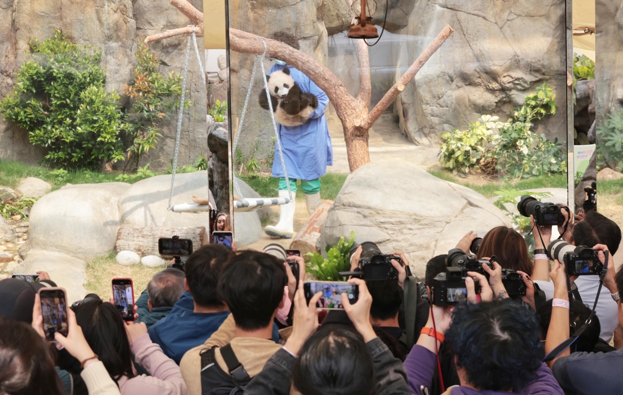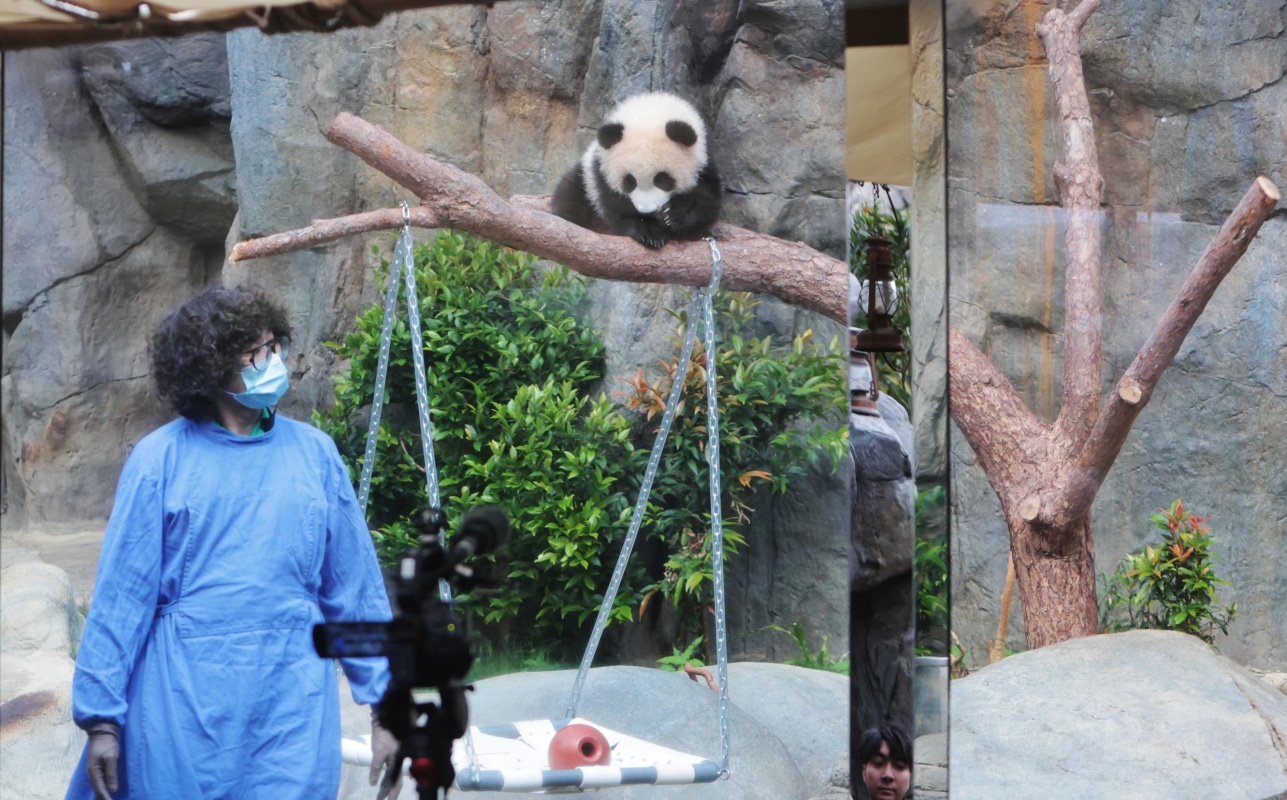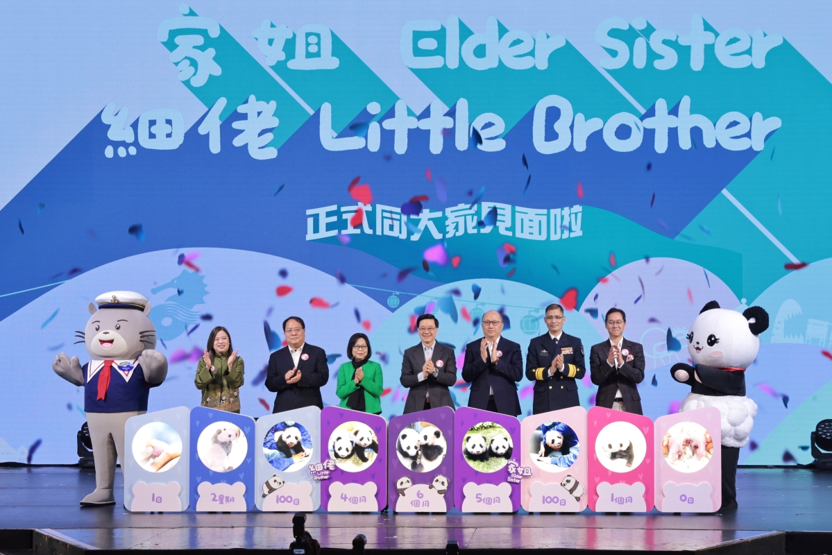 海洋公園舉行“大熊貓龍鳳胎寶寶亮相儀式”,港產大熊貓龍鳳胎寶寶“家姐”與“細佬”正式亮相,吸引大批傳媒關注
