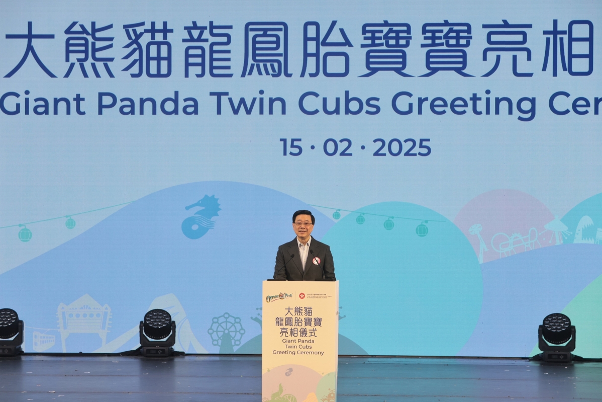 香港新聞網2月15日電(記者 謝光磊 ) 2月15日,香港海洋公園舉行“大熊貓龍鳳胎寶寶亮相儀式”,港產大熊貓龍鳳胎寶寶“家姐”與“細佬”將於明日(16日)正式與公眾見面。香港特區行政長官李家超、香港中聯辦主任鄭雁雄、海洋公園董事局主席龐建貽等嘉賓出席活動。當天,一對大熊貓龍鳳胎寶寶面對大批傳媒,表現活潑好動,十分可愛。