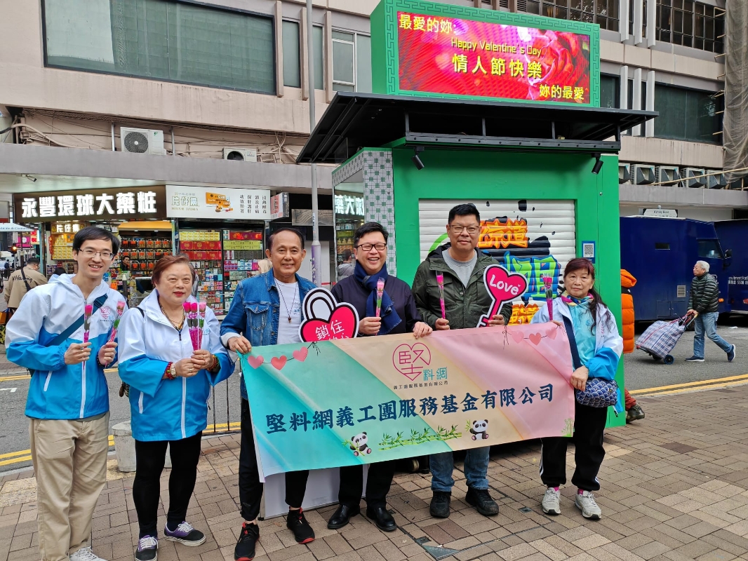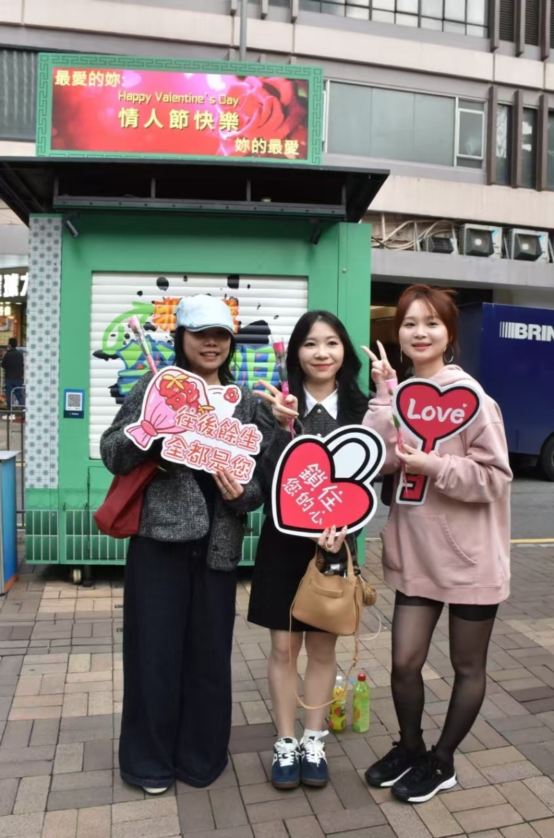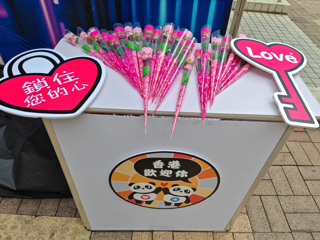 現場人潮湧動,外國遊客、內地遊客以及香港本地市民紛紛前來拍照打卡,熱鬧非凡。報攤周邊被裝飾得溫馨浪漫,包括電子屏幕、愛心打卡手牌。慈善團體的義工在此開展情人節的派花活動。義工們將愛心花送到遊客及市民手中,傳遞著節日的溫暖與愛意,也讓不少遊客停下腳步,沉浸在這溫馨的氛圍中。