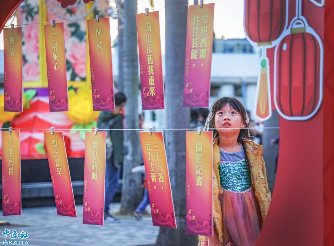元宵節將近,香港康文署由7日起到元宵節當日12日,於香港文化中心露天廣場及大堂舉辦元宵綵燈會,以“華燈.傳承”為題,展出約6米高的大型宮燈、由本地紮作師傅製作的小醒獅戲魚花燈,以及不同動物造型的綵燈。圖為現場設有猜燈謎活動。(香港中通社記者 曹文毓攝)