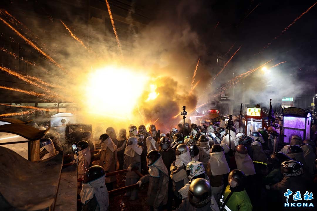 2月11日,台灣元宵節一年一度的台南鹽水“蜂炮”宣布正式開始,神轎從武廟出發繞境鹽水,250座炮城連續2天,分成好幾條路線接力開炸,要給民眾最難忘的“蜂炮”體驗,許多民眾全副武裝體驗犁“蜂炮”,隨著“蜂炮”竄動的景象,相當特別。“蜂炮”是指許多沖天炮組成的大型發炮台,點燃時萬炮齊發,會發出鳴聲。 香港中通社圖片