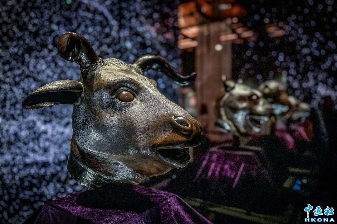 澳門保利美高梅博物館限時展出的四尊國家一級文物:圓明園獸首銅像,分別為牛首、虎首、猴首、豬首。每尊獸首銅像造工精細,面部絨毛及褶皺清晰可見,吸引大批遊客排隊觀賞。(香港中通社記者 曹文毓攝)
