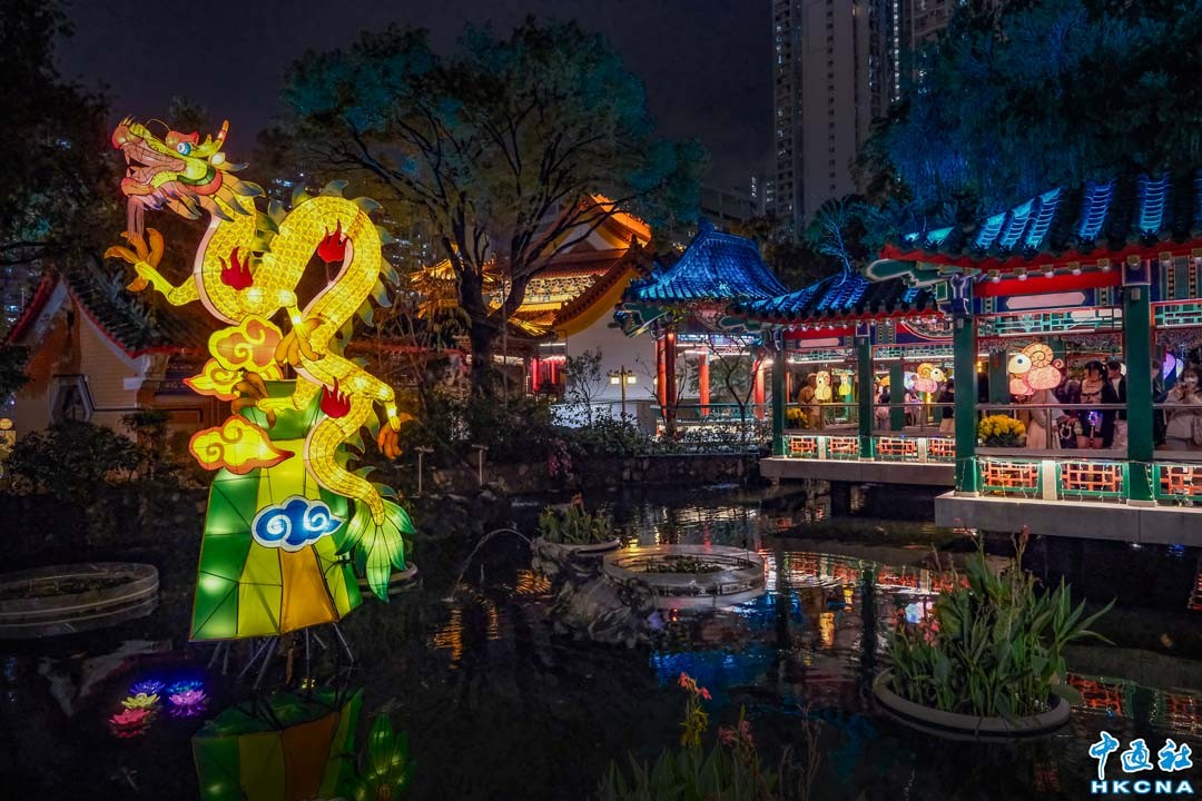 2月12日是農曆元宵節,香港大批市民到黃大仙祠歡度佳節。圖為市民逛黃大仙祠,賞花燈。(香港中通社記者 許其皓攝)