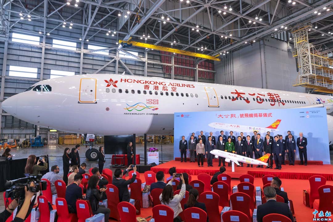 2月14日,“大公報”號飛機在香港國際機場揭幕。今年是抗日戰爭勝利80周年。香港大公文匯傳媒集團與香港航空攜手,共同打造“大公報”號飛機,既是向中國首架“大公報”號滑翔機的抗日義舉致敬,也是香港愛國主義教育的生動體現。(香港中通社記者 謝光磊攝)