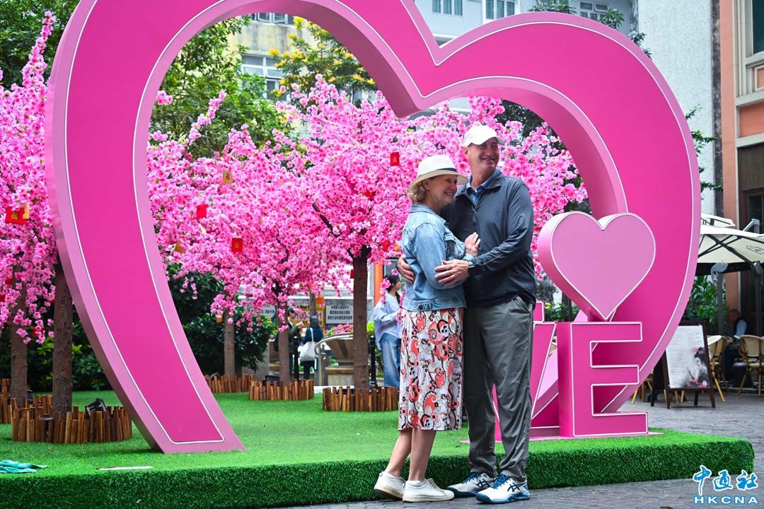 2月14日是西方情人節,香港利東街的心形彩飾吸引遊客駐足感受節日氣氛。 (香港中通社記者 洪少葵攝)