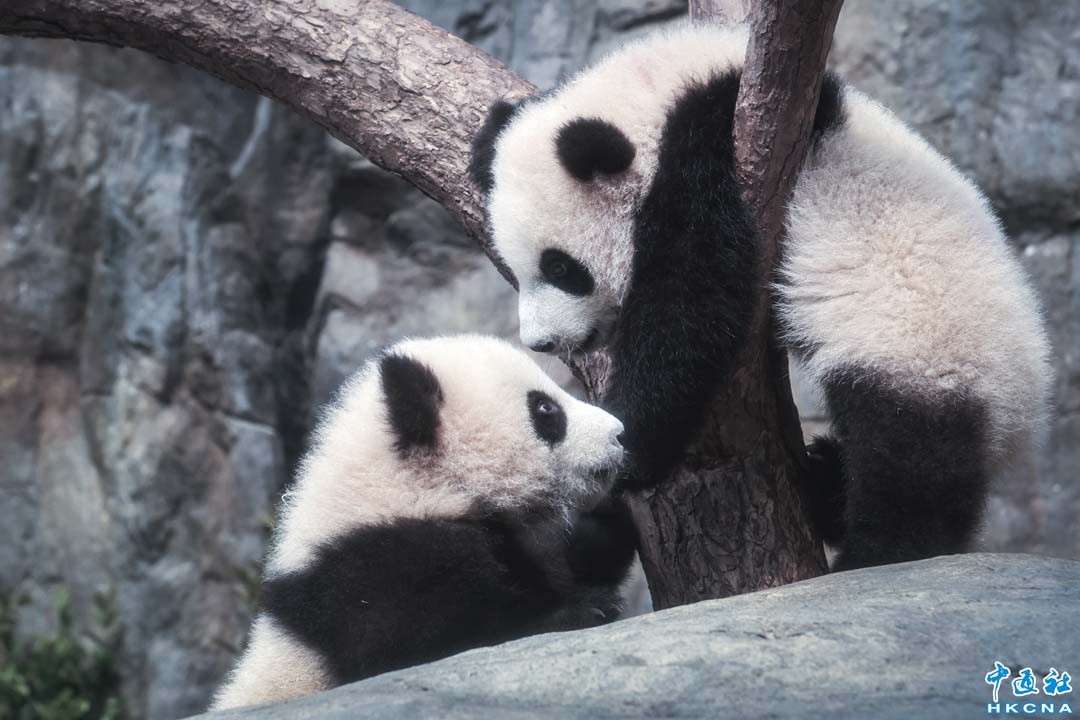 2月15日,香港海洋公園舉行“大熊貓龍鳳胎寶寶亮相儀式”,一對港產大熊貓龍鳳胎寶寶“家姐”與“細佬”面對大批傳媒,表現活潑好動,十分可愛。“家姐”與“細佬”將於明日(16日)正式與公眾見面。(香港中通社記者 謝光磊攝)